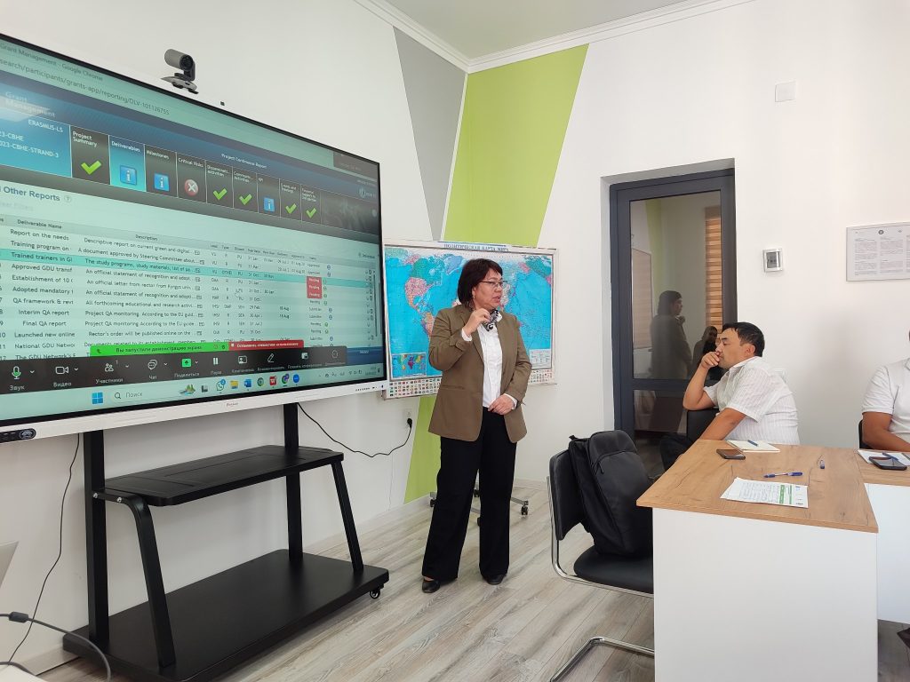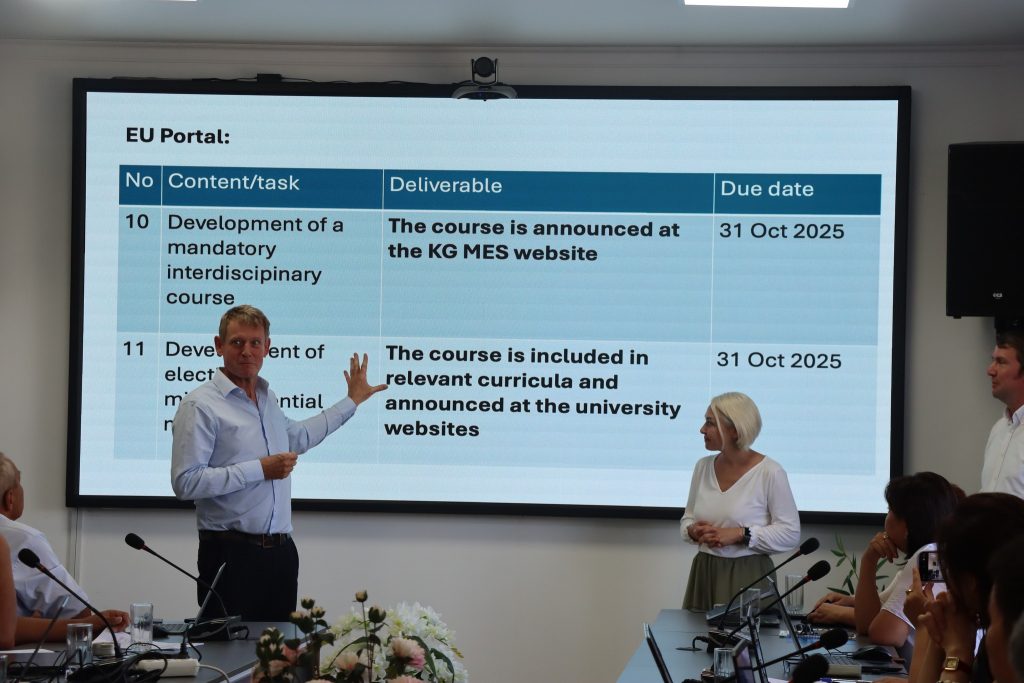 2–3 сентября 2025 года в ИГУ им.К.Тыныстанова в рамках проекта «Green and Digital Universities for Sustainable Development of Kyrgyzstan» (GREENKG) программы Erasmus+ Европейского Союза состоялись заседания Steering Committee Meeting и Project Management Board (PMB).В работе Steering Committee Meeting принял участие заместитель министра науки, высшего образования и инноваций Кыргызской Республики Нурлан Кубатович Омуров. Участники заседания обсудили ход реализации проекта, модель «Зеленого и цифрового университета», а также утверждение обязательного междисциплинарного модуля и элективных микро-кредитных курсов для университетов Кыргызстана. Особое внимание было уделено вопросу официального признания и утверждения курсов Министерством науки, высшего образования и инноваций Кыргызской Республики.На заседании Project Management Board, где были рассмотрены:-отчет о прогрессе проекта (координатор проекта Жанара Байтүгөлова, проректор Дипломатической академии им. К. Дикамбаева МИД КР);-подготовка второй волны тренингов для университетов-партнеров;-вопросы обеспечения качества проекта и предложения по его совершенствованию (Махабат Карагулова);-пересмотр deliverables в соответствии с комментариями грантодателя;-дальнейшие шаги по финализации обязательного междисциплинарного модуля и элективных микро-кредитных модулей, включая разработку электронных учебных материалов, видеоуроков, инструментов самостоятельного обучения и интеграцию в Moodle LMS.Заседания Steering Committee и PMB подтвердили приверженность партнеров проекта задачам устойчивого развития, цифровой трансформации и экологизации системы высшего образования Кыргызстана.